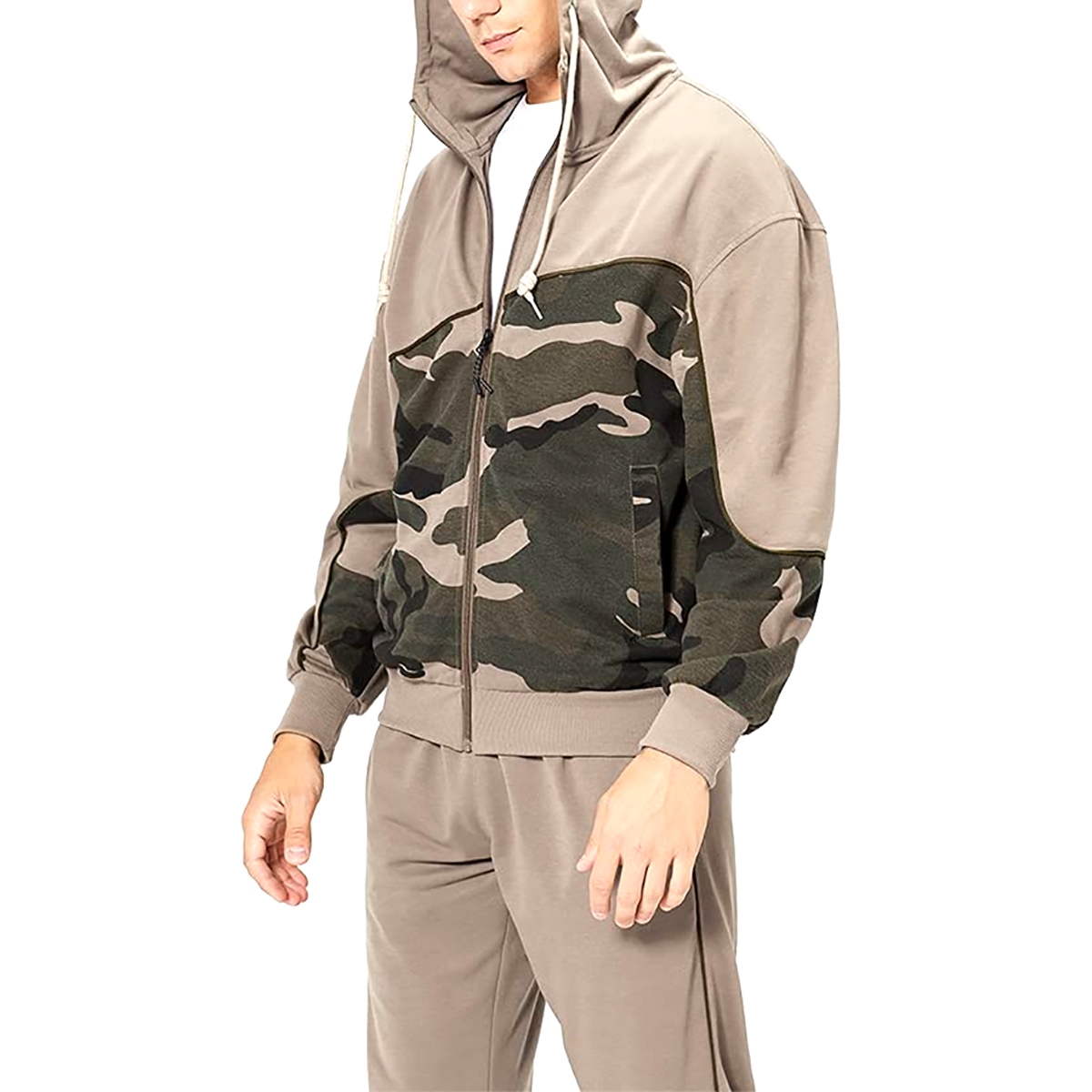 - These tracksuits set contain a hooded sweatshirt and a pair of joggers. Features fashion camoflage design. Stretchy material allows greater mobility when you doing exercise.