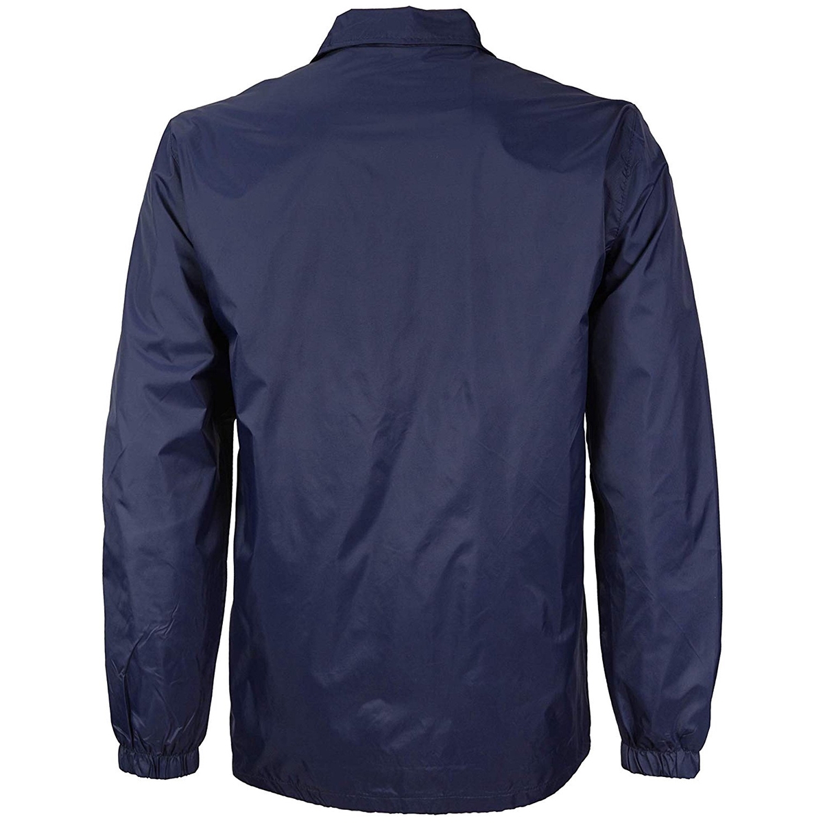 This premium coach jacket features a spread collar, long sleeves, banded cuffs, two front slit pockets and a front button fastening with adjustable tabs at the waist.